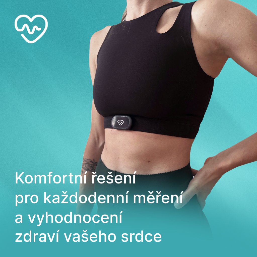 - Hrudní pás se snímačem EKG přenáší signál přes Bluetooth do mobilní aplikace Kardi Ai.